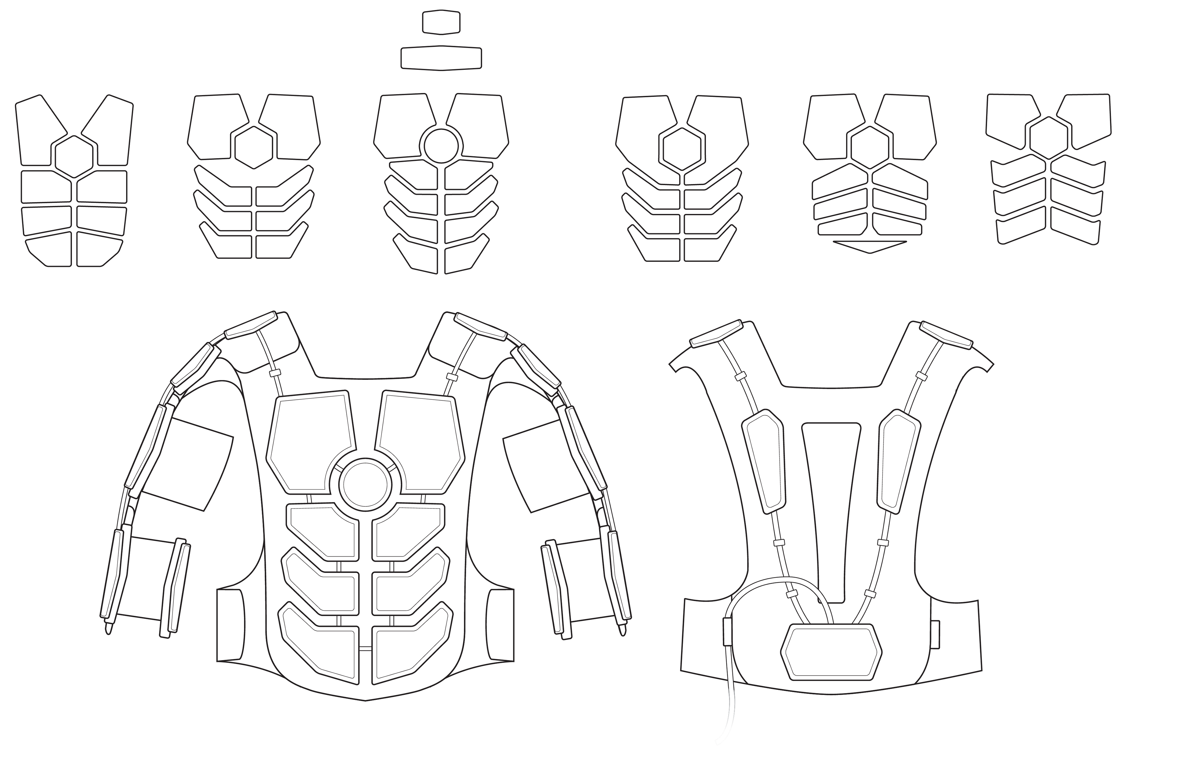 The client wanted the product to have a futuristic, technical armor appearance that would appeal to their gamer market base. I pulled inspiration from video game armor as well as real-world body armor and bulletproof vests during my sketch development.
